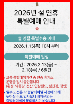 2026년 설날 연휴 특별 예매는 1월 15일(목) 오전 10시부터 시작됩니다.